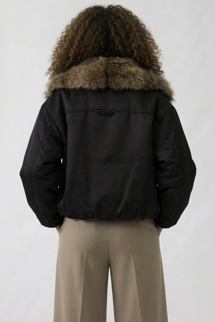 Dieser Faux-Fur Bomber ist das perfekte Statement-Piece für alle, die es warm, weich und trotzdem ultra-stylisch wollen. Die Jacke kombiniert eine klassische Bomberform mit einem luxuriösen, voluminösen Kunstfellkragen, der sofort ins Auge fällt und jedes Outfit teurer wirken lässt.