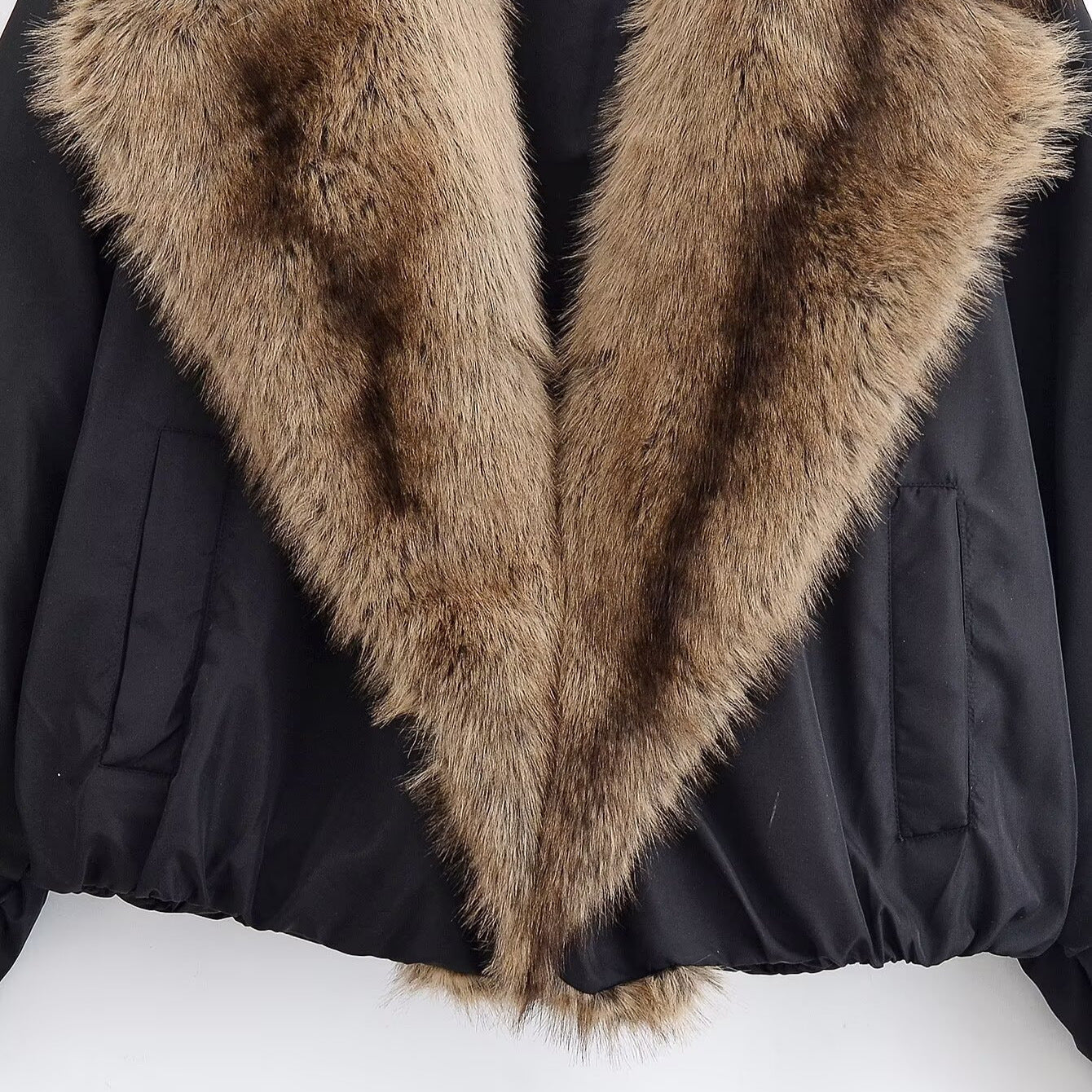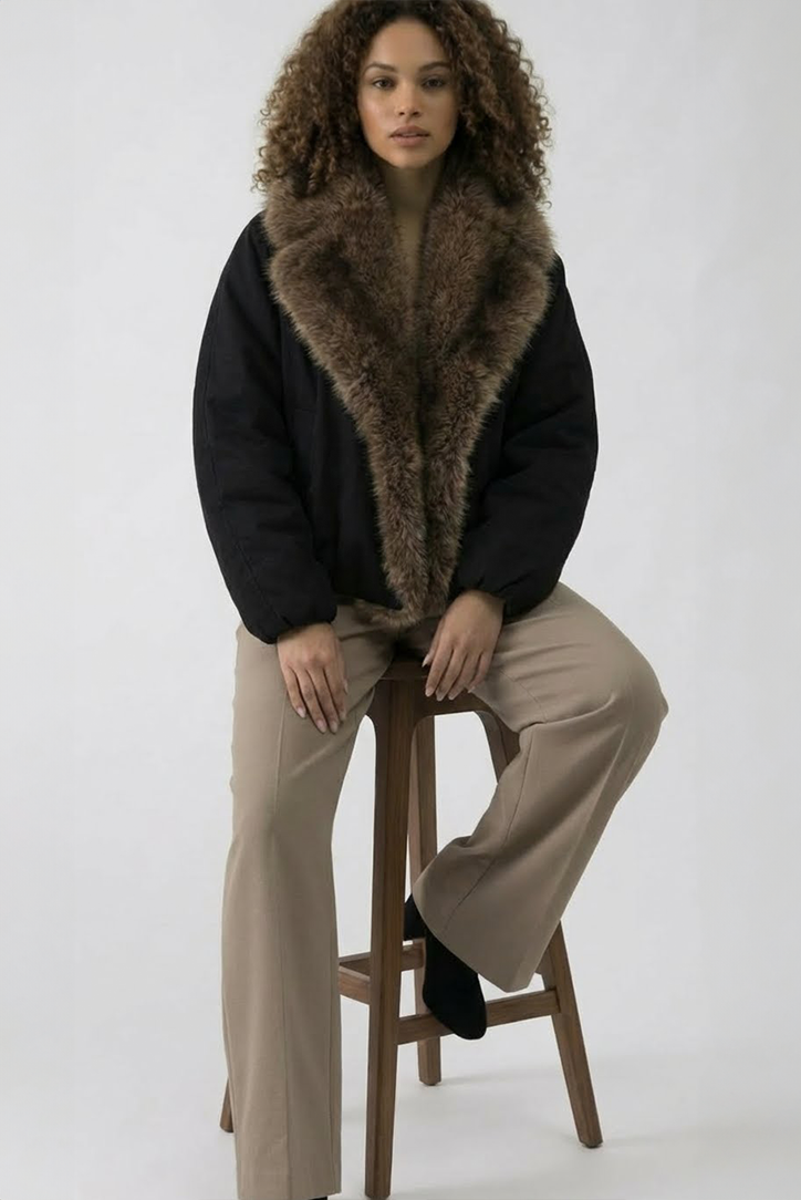 Der Body besteht aus einem matten, hochwertigen Stoff, der Wind abhält und leicht glänzt – ohne billig zu wirken. Der XXL-Faux-Fur-Kragen gibt der Jacke einen modernen, winterlichen Look und macht sie zum perfekten Mix aus chic und cozy.