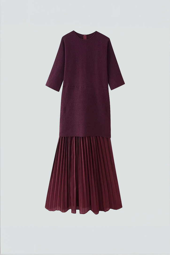 Ein stilvolles Kleid mit modernem Kontrast: Das Oberteil ist schlicht gehalten mit halblangen Ärmeln und rundem Kragen, während der plissierte untere Teil für Bewegung und Eleganz sorgt. Dieses Midikleid ist aus weichem, strukturiertem Stoff gefertigt und perfekt für Büro, Dinner oder Alltag. Lässt sich sowohl casual mit Sneakern als auch schick mit Heels tragen.