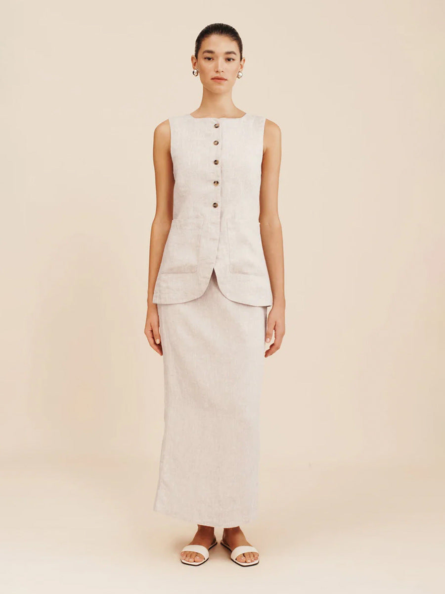 Die Knopfleiste an der Vorderseite verleiht der Weste einen stilvollen Look, während der lange Rock mit seinem minimalistischen Schnitt für eine schlanke Silhouette sorgt. Perfekt für sommerliche Tage oder schicke Abendveranstaltungen.