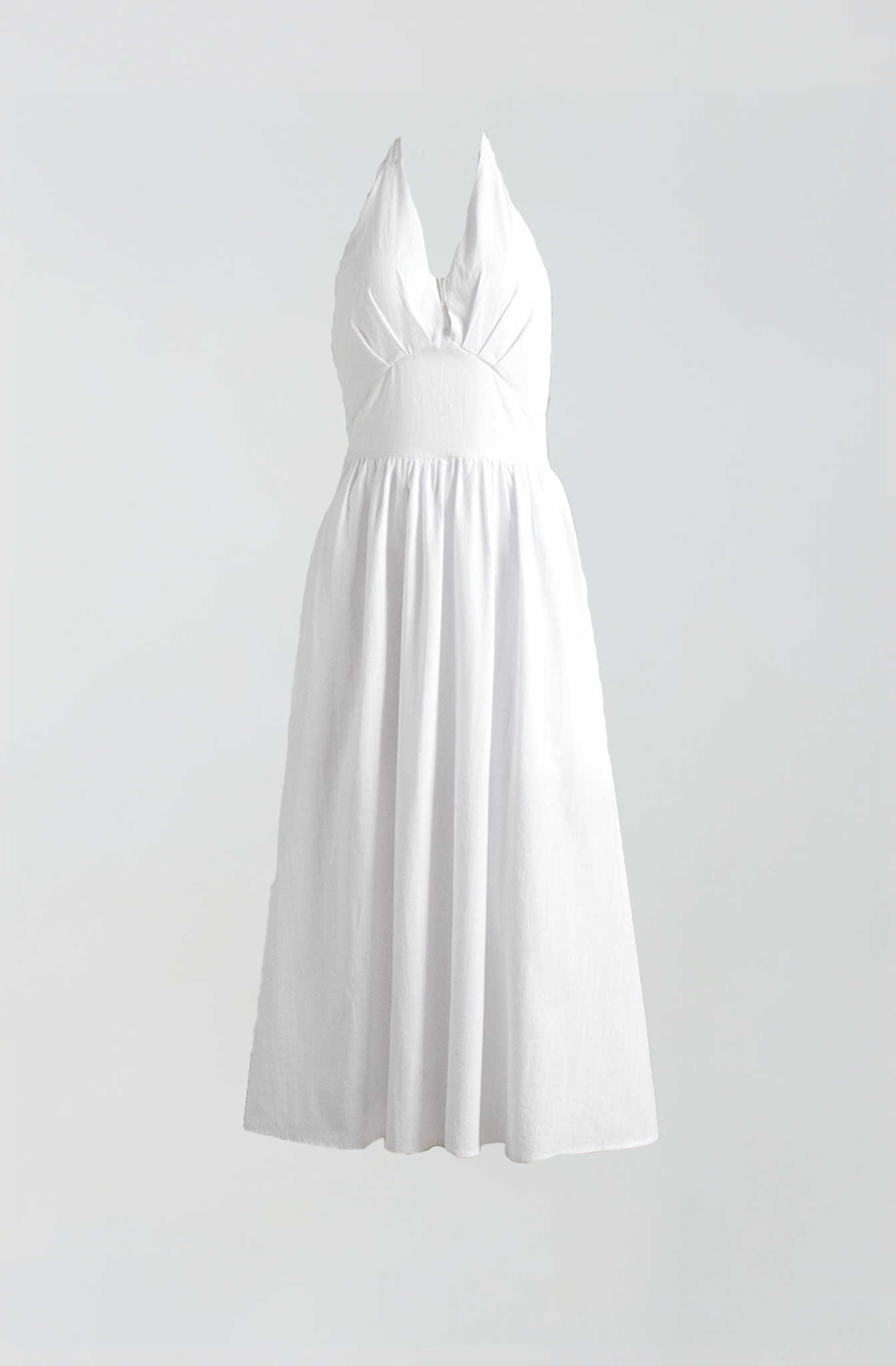 Dieses elegante Maxi-Kleid mit tiefem V-Ausschnitt und fließendem Design verleiht dir einen zeitlosen Look. Der ärmellose Schnitt und der leichte Baumwollstoff machen es perfekt für warme Tage oder besondere Anlässe. Der hohe Taillenbund sorgt für eine schmeichelhafte Silhouette, während das lange, luftige Rockteil für einen eleganten Auftritt sorgt.