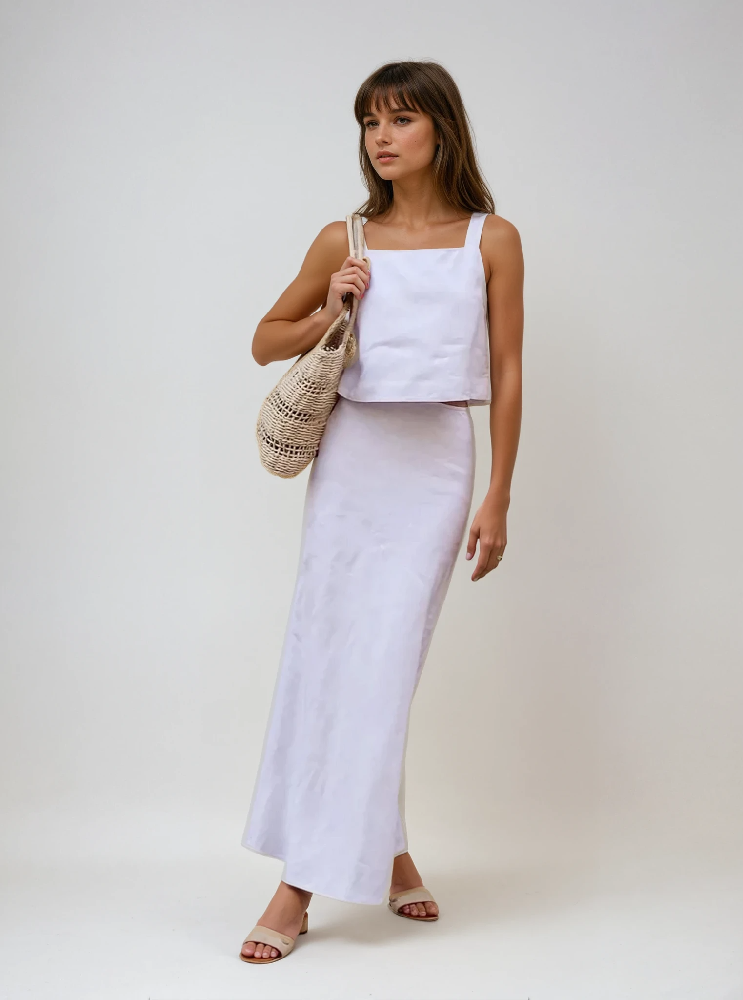 Dieser elegante Zweiteiler aus einer hochwertigen Leinenmischung ist die perfekte Wahl für warme Tage. Das ärmellose, locker geschnittene Top mit asymmetrischem Schnitt verleiht dem Look eine moderne Note, während der lange, fließende Rock eine feminine Silhouette zaubert. Die hochwertige Materialkombination sorgt für ein angenehmes Tragegefühl und Atmungsaktivität.