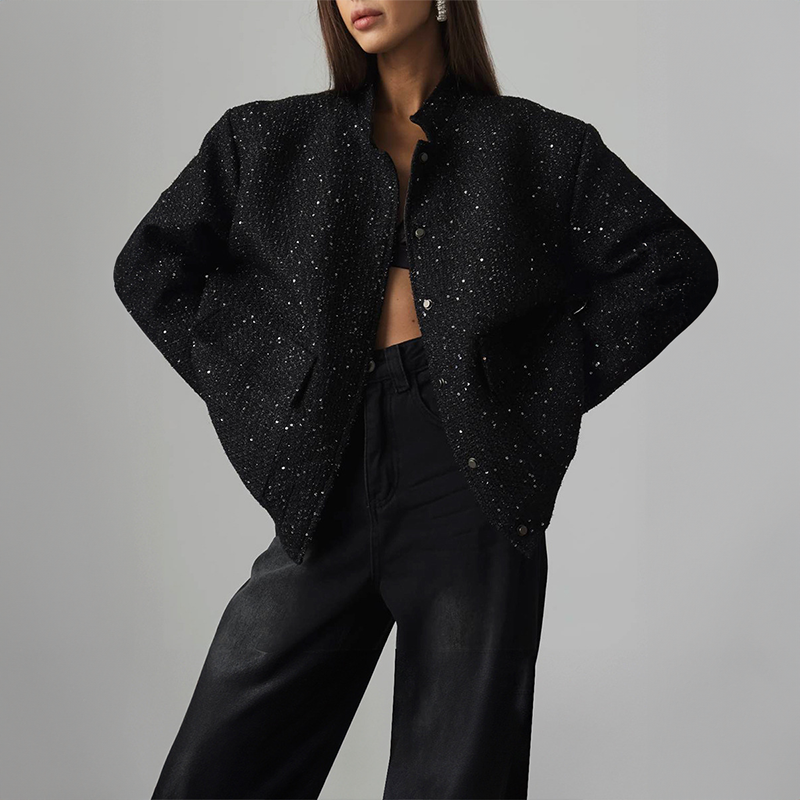 Diese einzigartige Jacke kombiniert Stil und Komfort mit ihrem hochwertigen, glänzenden Finish. Aus 100% Polyester gefertigt, überzeugt sie durch ihre luxuriöse Optik und ihr leichtes Gewicht von 750 g. Der Oversized-Schnitt und die metallischen Akzente machen sie zum perfekten Statement-Piece für elegante und lässige Looks. Mit praktischen Taschen und einem modischen Design ist sie ein Must-Have für modebewusste Frauen. Erhältlich in den Größen S, M und L.