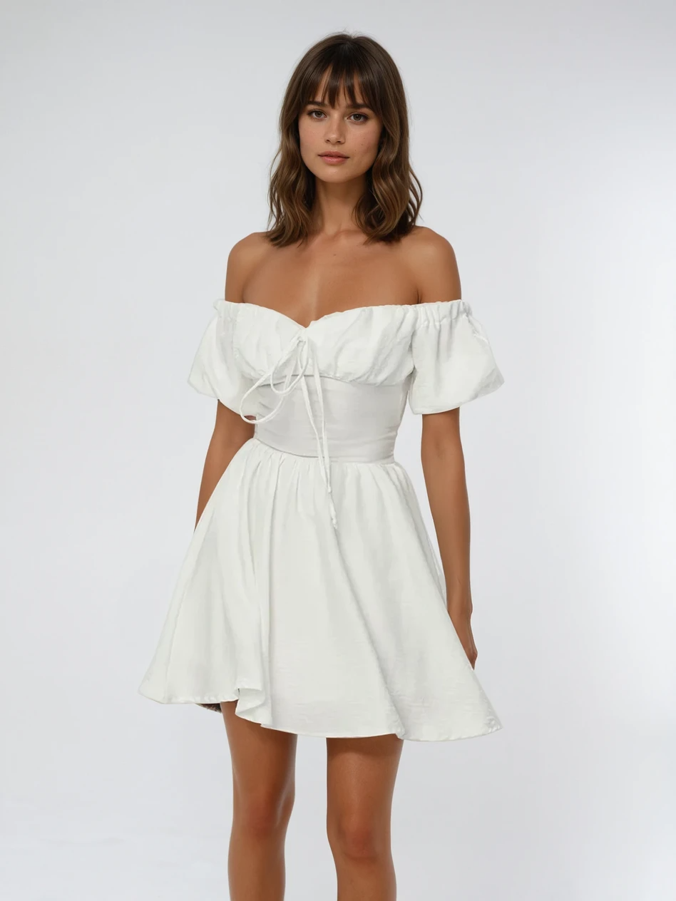 Dieses bezaubernde Off-Shoulder-Kleid mit kurzen Puffärmeln verleiht jedem Look eine verspielte und feminine Note. Die elastische Taille sorgt für eine schmeichelhafte Passform, während das leichte Material optimalen Tragekomfort bietet. Perfekt für Sommertage, Dates oder elegante Anlässe.