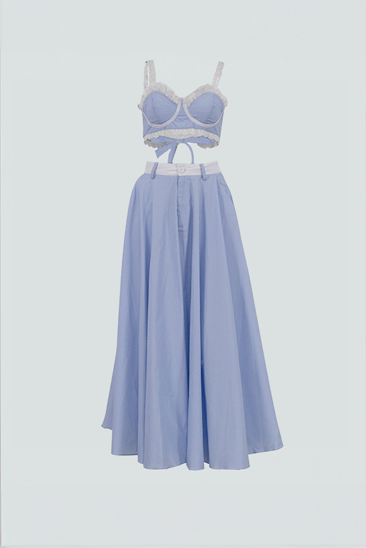 Schnitt: Crop-Top mit Bügel, High-Waist Rock mit weitem Schwung
