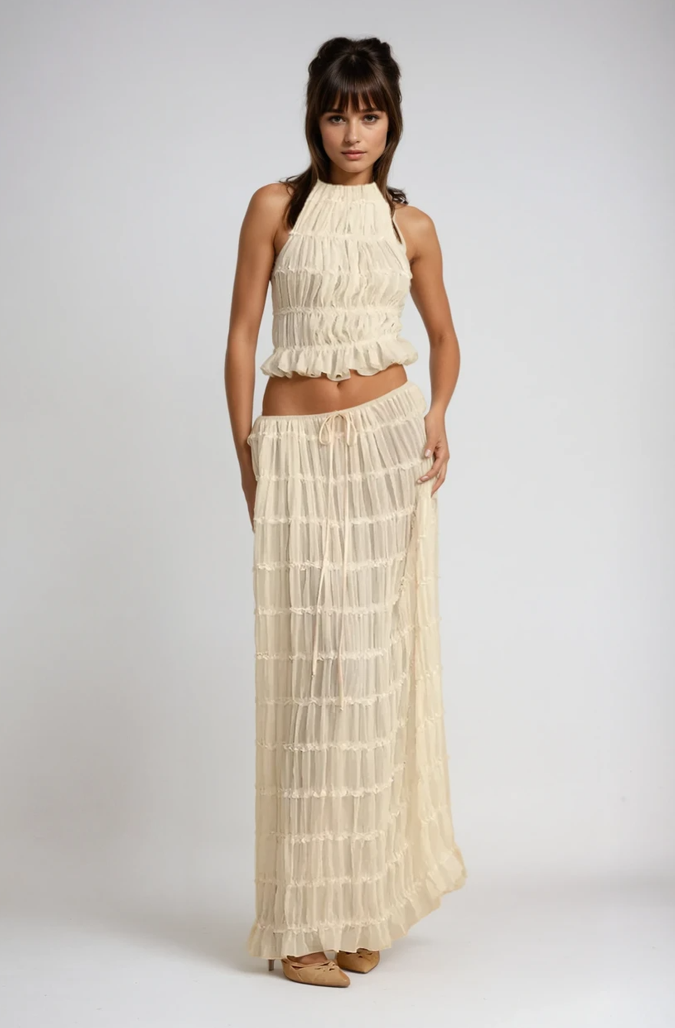 Dieser luftige Zweiteiler ist die perfekte Wahl für sommerliche Tage und stilvolle Strandlooks. Das Set besteht aus einem ärmellosen, bauchfreien Top mit Neckholder und einem fließenden Maxirock mit elastischem Bund für maximalen Komfort. Die leichte Stoffstruktur sorgt für eine feminine und entspannte Ausstrahlung – ideal für Urlaub, Festivals oder entspannte Stadtbummel.