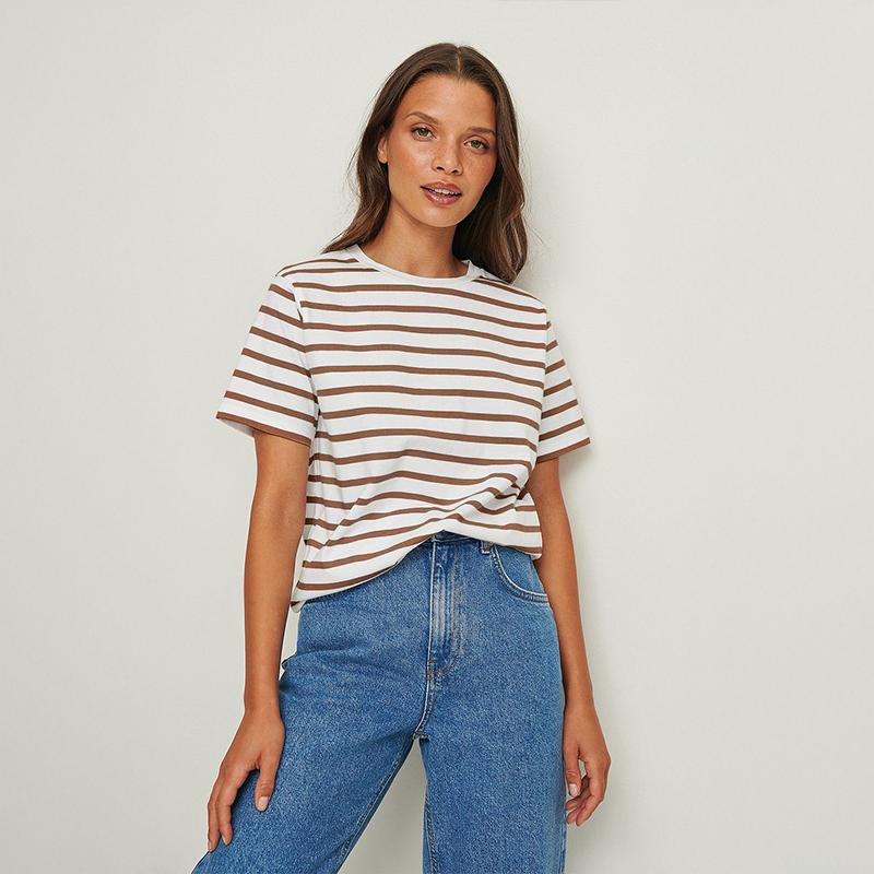 Dieses vielseitige gestreifte T-Shirt mit Rundhalsausschnitt ist ein zeitloses Basic für jeden Kleiderschrank. Gefertigt aus 95% Baumwolle und 5% Spandex, bietet es hohen Tragekomfort und eine perfekte Passform. Mit einem Gewicht von nur 180 g eignet sich dieses Shirt ideal für den Alltag oder zum Layering an kühleren Tagen. Die dezenten Streifen in natürlichen Farben verleihen Ihrem Look eine lässige und zugleich moderne Note.