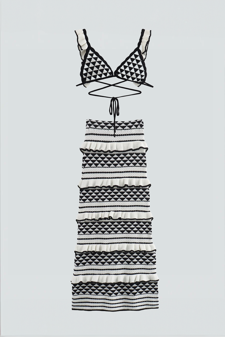 Dieses schwarz-weiße Häkelset mit geometrischem Muster sorgt für maximalen Auftritt – ob am Strand oder auf dem Festival. Das verspielte Oberteil zum Schnüren betont dein Dekolleté, während der Minirock mit Rüschensaum deine Taille in Szene setzt. Das gestrickte Material schmiegt sich deinem Körper an und bleibt dabei angenehm luftig. Perfekt für heiße Sommertage oder laue Nächte.