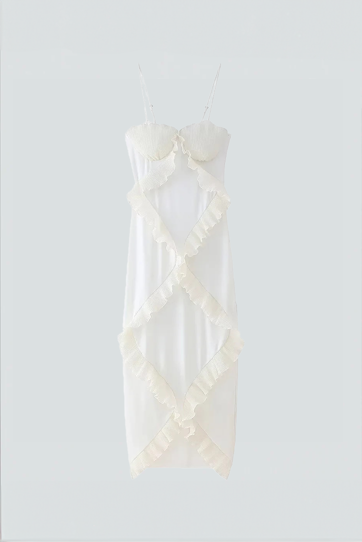 Ein absoluter Hingucker für den Sommer: Dieses Maxikleid mit zarten Spaghettiträgern und auffälligen Spitzenrüschen zaubert eine traumhaft feminine Silhouette. Der figurbetonte Schnitt und die verspielten Details sorgen für ein sinnliches, aber elegantes Auftreten – perfekt für Events, Strandabende oder heiße City-Tage.