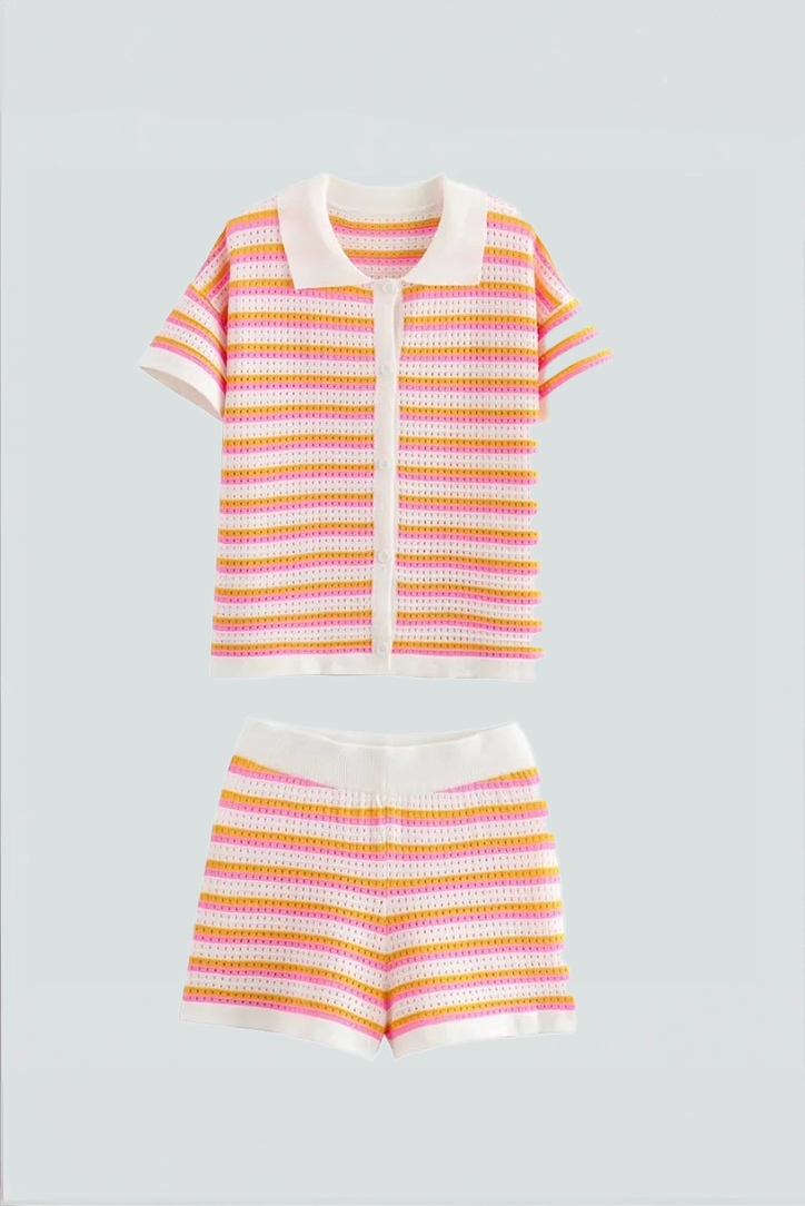 Dieses luftige Zweiteiler-Set mit pink-gelben Streifen ist der perfekte Begleiter für entspannte Sommertage. Das locker geschnittene Oberteil mit Kragen trifft auf eine bequeme Shorts mit Gummibund – ideal für den Strand, einen Cafébesuch oder unterwegs in der Sonne.